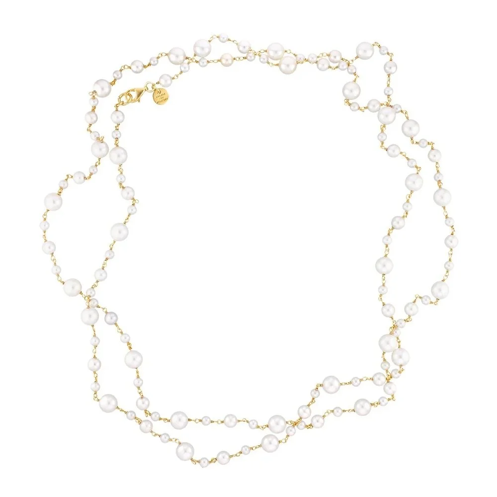 Eine extralange Kette mit weißen Perlen in Silber 925, die vergoldet ist, biete einen eleganten Look. Die Möglichkeit, sie doppelt oder einfach zu tragen, macht sie noch praktischer und anpassungsfähiger. So kann man sie sowohl im Alltag als auch zu besonderen Anlässen vielseitig einsetzen.