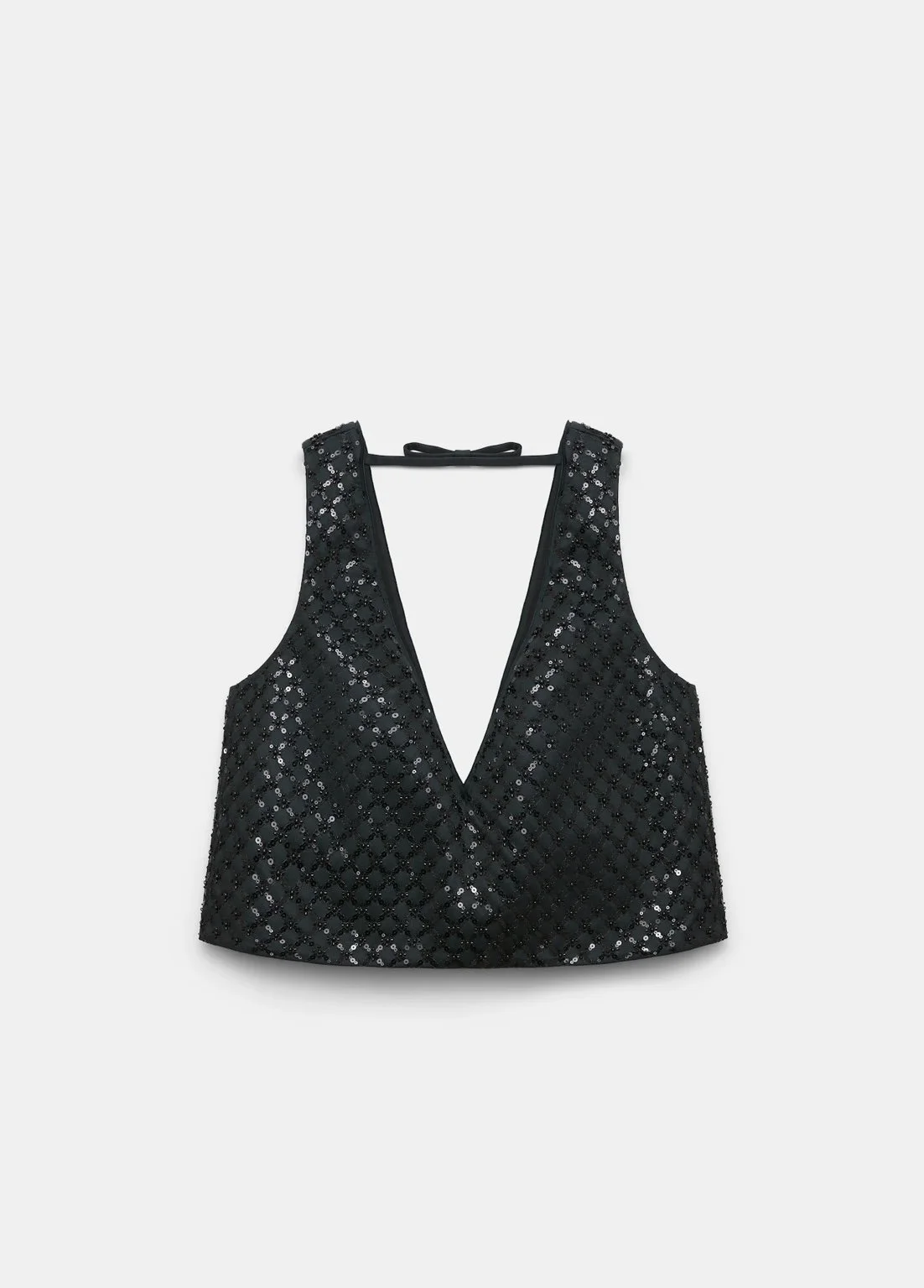 Dressed up in Duchesse: Das Crop-Top ist aus Duchesse gefertigt und mit floralen Paillettenmustern verziert. Das Top hat vorne und hinten einen tiefen V-Ausschnitt und kann elegant mit passender Hose oder lässig mit Jeans getragen werden.