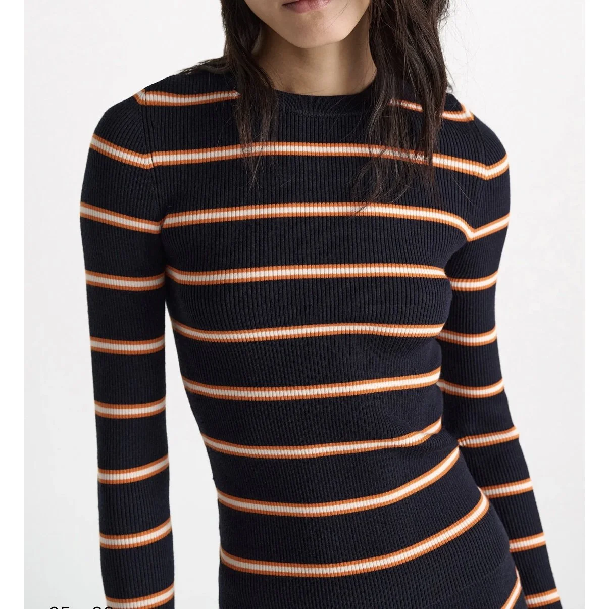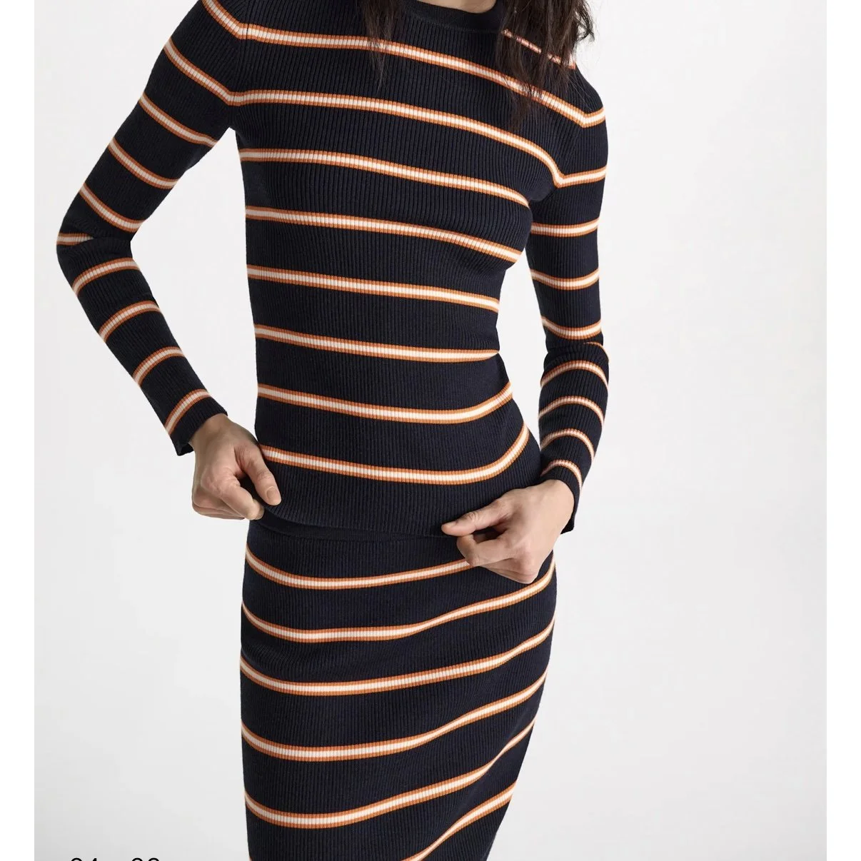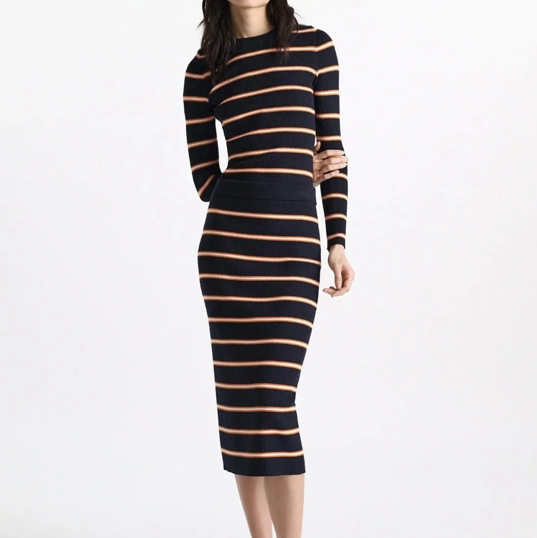 Der gestreifte Pullover hat einen Rundhalsausschnitt und ist aus einem dehnbaren Woll-Seiden-Mix gestrickt. Trage das gerippte Design als Set mit dem passenden Rock.